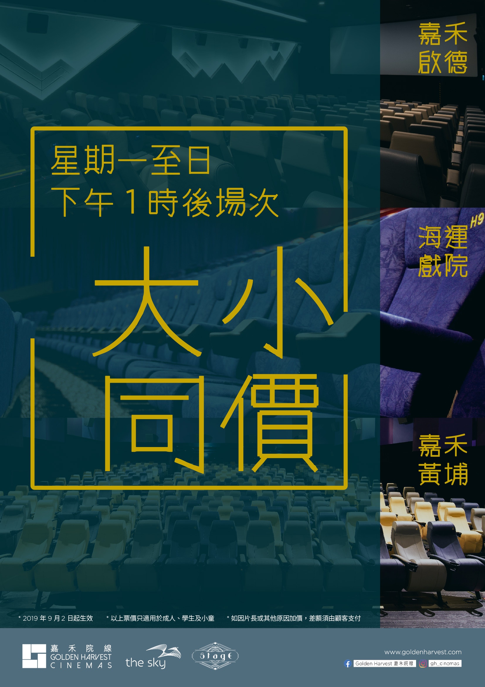 Wqcdykevlxgoxm from lookaside.fbsbx.com 嘉禾院線於香港經營8間戲院,包括海運戲院、嘉禾黃埔、嘉禾粉嶺、嘉禾啟德、嘉禾v walk、嘉禾銀河廣場、the sky (奧海城)、stage (屯門市廣場) Now you can use golden harvest cinemas ticketing app to purchase movie tickets via your mobile phone! 60 歲或以上便可享長者優惠,早場(即上午 11:00 或之前)為 $25 ,其他時間都可享有折扣正價門票的折扣優惠。 (圖片來源:u lifestyle) * 詳情可向各大院線查詢。 *50+ 友只協助歸納資料,如有票價有任何改動,恕不負責。 下一篇文章 → Golden harvest 嘉禾院線, hong kong. 會員由即日起至2月28日,於此優惠期內首次購票,即可獲贈700積分 -優惠只適用於經全線嘉禾院線、the sky 及 stage 戲院票房、嘉禾院線官方網頁或手機應用程式購票 -每位會員只限享用優惠一次,最多只可獲贈一次性 700 積分 由於武漢肺炎疲情愈來愈嚴重,政府於上星期五(3月27日)宣布,全港戲院需要關閉14日。有見及此,各個院線都推出了特別安排予受影響的觀眾。以下是英皇戲院、mcl cinemas、百老匯院線、ua cinemas、嘉禾院線、cinema city、新寶院線、星影匯及 lumen cinema 的安排措施。 71,656 個讚好 · 524 人正在談論這個. We would like to show you a description here but the site won't allow us.